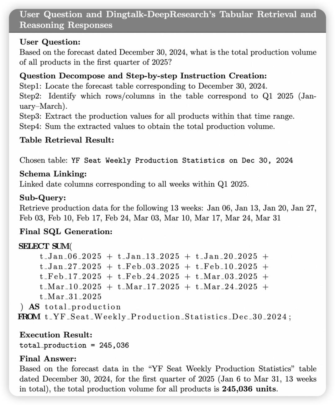 在企业环境中,表格数据往往与文本叙述混合,形式多样且结构复杂。Dingtalk-DeepResearch 的表格问答模块通过结合布局感知表格建模和异构检索-执行,实现了精确且可解释的推理。