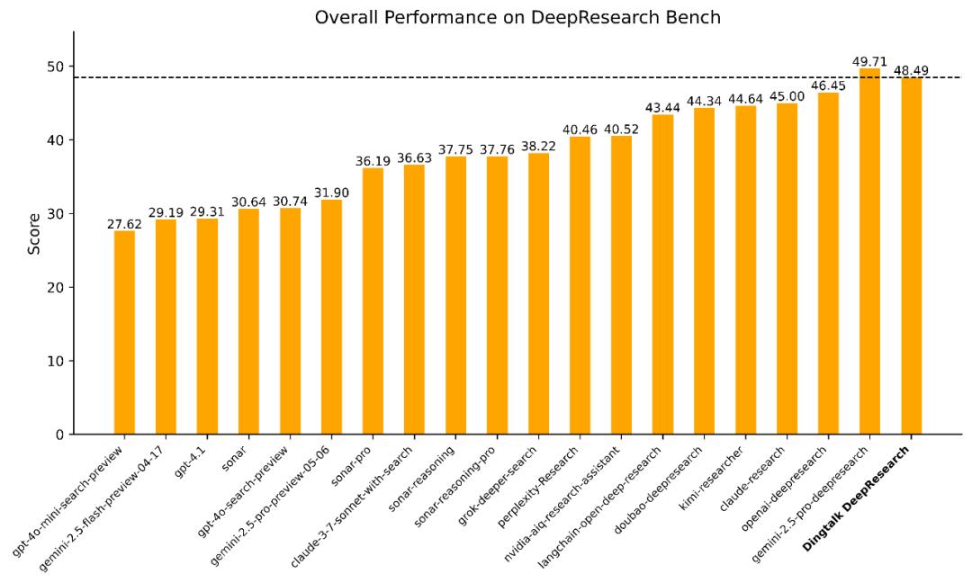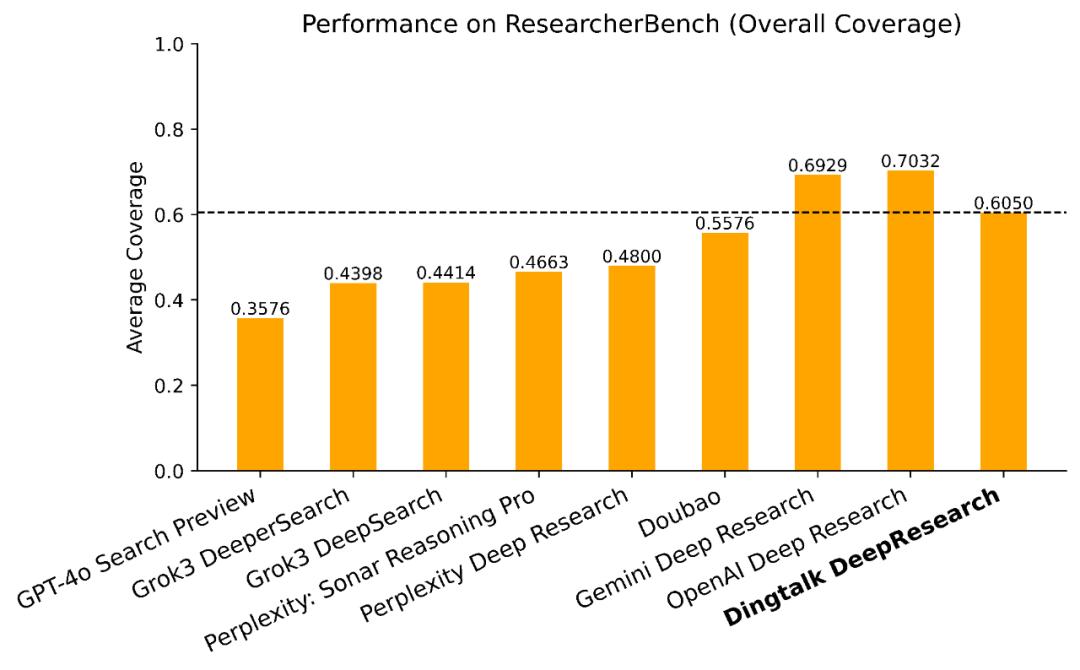 论文地址:https://arxiv.org/abs/2510.24760 Dingtalk-DeepResearch 在国际权威深度研究评测 DeepResearch Bench 中取得 48.49 高分(全球第二、国内第一),显著超越包括 OpenAI、Claude 在内的主流系统;并在 ResearcherBench 达到 0.7032 平均覆盖率(全球第三、国内第一)。