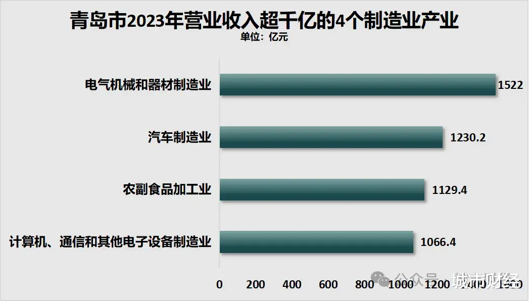 按照工信部划分的41个工业大类,青岛拥有4个营业收入过千亿的产业,不过没有一个超2000亿的产业。