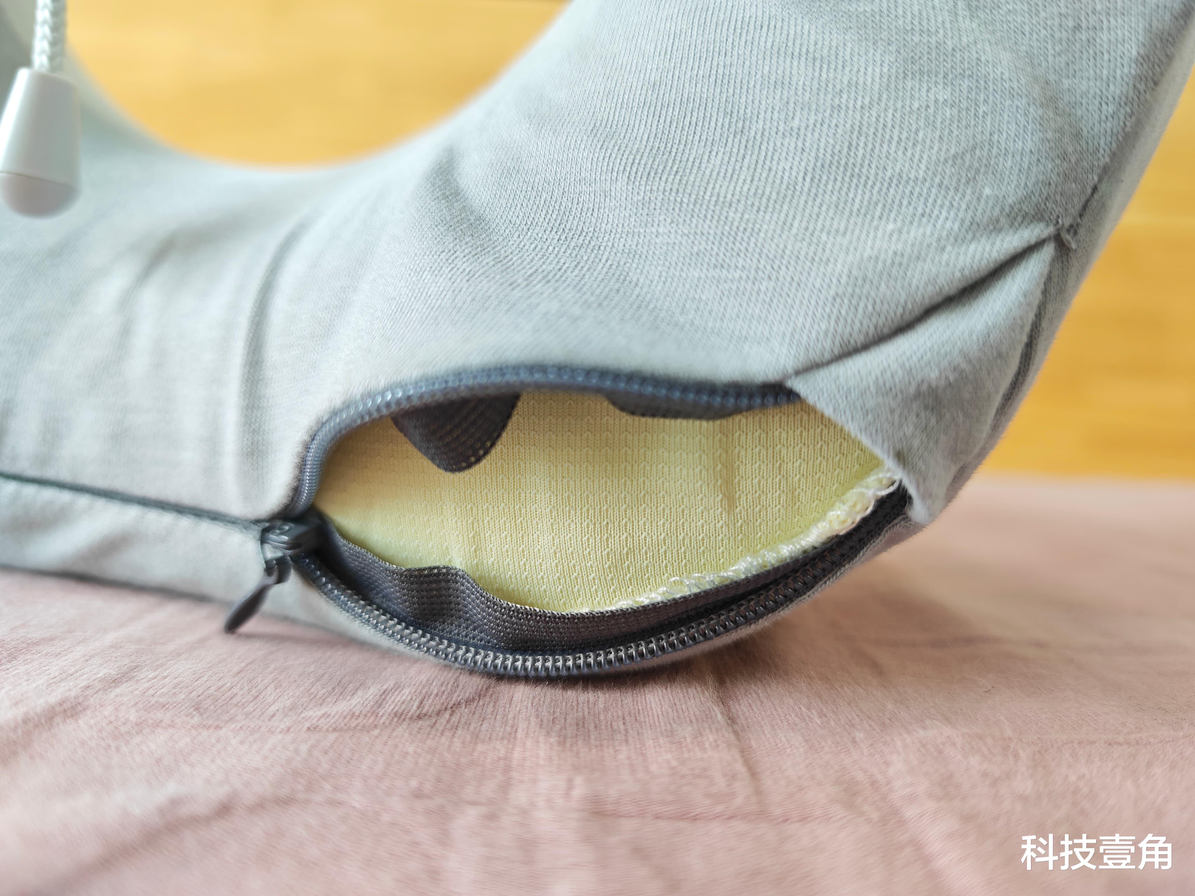 官方宣称采用50D非温感记忆绵芯,具有非牛顿流体质感。实际体验下来,它的确非常柔软,轻轻按压便能贴合颈肩曲线。但当我因气流颠簸猛然晃动头部时,又清晰感觉到内芯瞬间提供了坚实的缓冲支撑,稳稳吸收掉了冲击能量。这种能在日常使用时极致柔软,遇突发外力时又能瞬间强韧的特点,确实独特。长时间佩戴,肩膀也未感到以往常见的局部压迫酸痛,压力均匀分散的特性名副其实。无论是早班机清冷的机舱,还是午后闷热的列车车厢,枕芯硬度始终如一,避免了温感记忆棉忽软忽硬的问题。