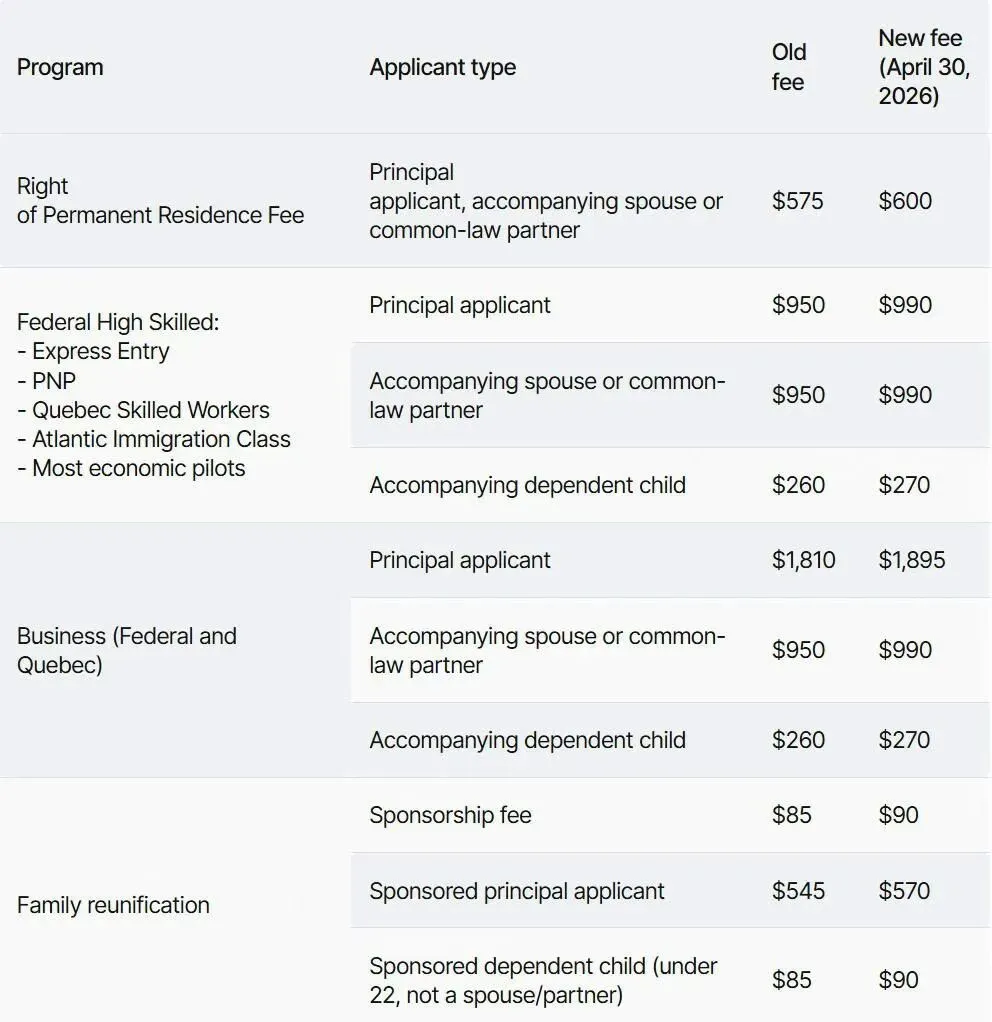 ☑ 经济类移民(EE / PNP 等)主申请人:$950 → $990配偶:$950 → $990子女:$260 → $270