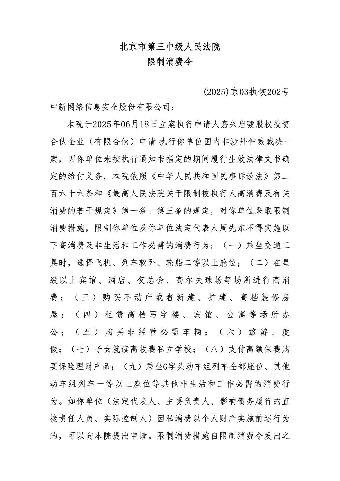 本院于 2025 年 06 月 18 日立案执行申请人嘉兴启骏股权投资合伙企业(有限合伙)申请执行你单位国内非涉外仲裁裁决一案,因你单位未按执行通知书指定的期间履行生效法律文书确定的给付义务,本院依照《中华人民共和国民事诉讼法》第二百六十六条和《最高人民法院关于限制被执行人高消费及有关消费的若干规定》第一条、第三条的规定,对你单位采取限制消费措施,限制你单位及你单位法定代表人周先东不得实施以下高消费及非生活和工作必需的消费行为。