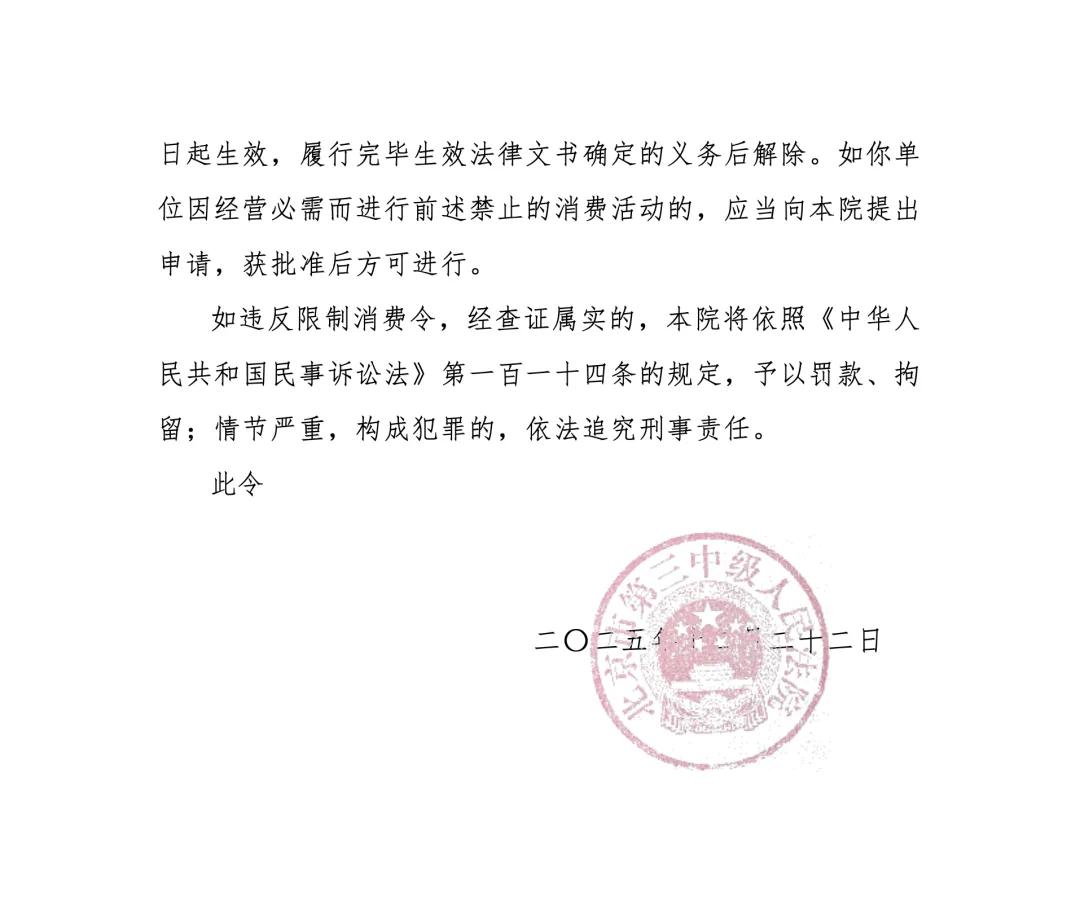 北京市第三中级人民法院发布《限制消费令》。