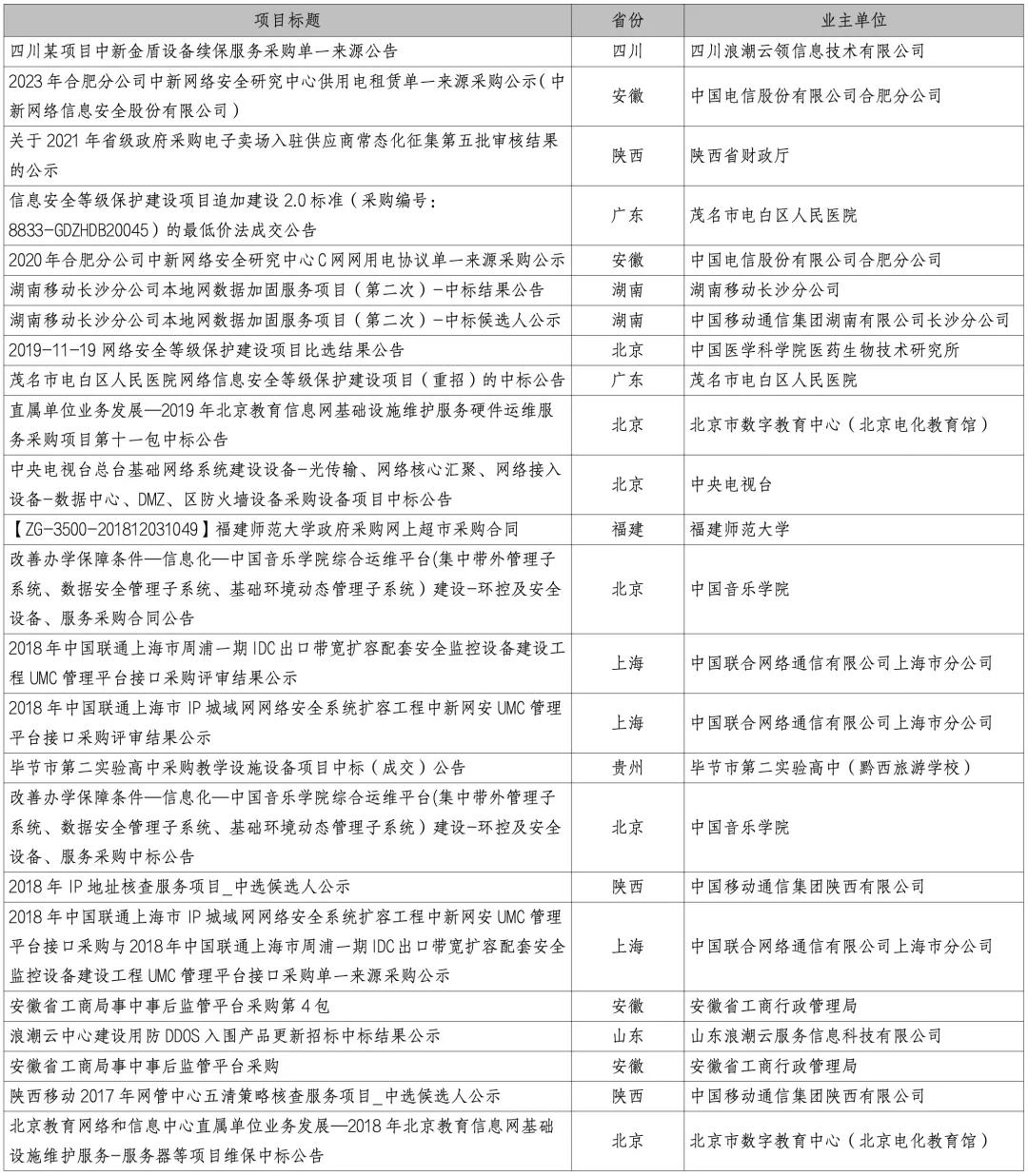 中新网安中标项目一览: