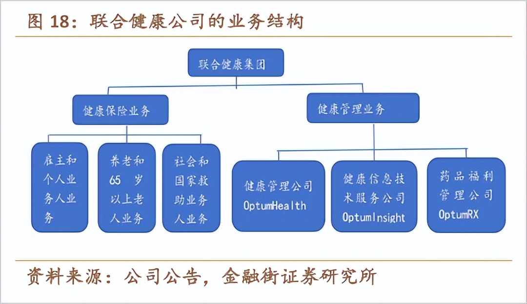 联合健康业务板块主要分为United Healthcare(健康保险)和Optum(医健服务)两大核心,打通了医险商业闭环,颠覆了传统保险公司对保费的过度依赖。