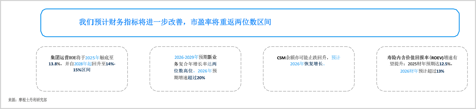 尤其是核心财务指标将逐步优化,预计寿险合同服务边际余额CSM(代表着未来释放的留存利润)将于2026年恢复1.9%的增长,集团营业利润未来两年将呈现11%的复合年增长率。