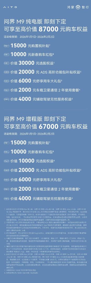 值此新春团圆之际,问界M9特别推出新春购车礼遇,纯电版至高可享87000元购车权益,增程版至高67000元福利,涵盖购置税补贴、新春购车红包、选配权益、ADS高阶功能包补贴等多重惊喜,活动有效期至2026年2月2日。
