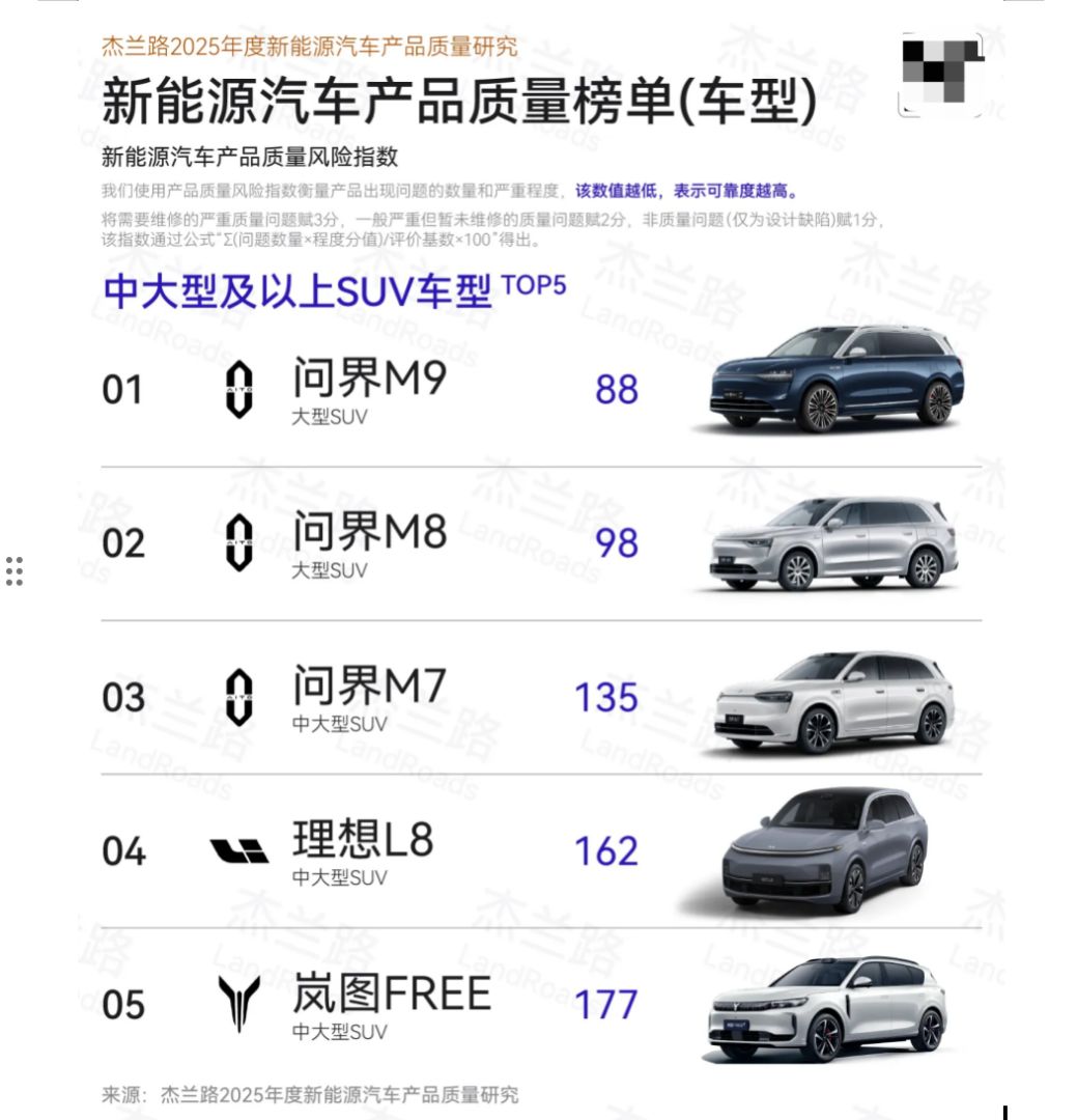 近日,杰兰路发布的《2025年度新能源汽车产品质量研究》给出权威答案——问界M9以卓越的质量稳定性,斩获中大型及以上SUV新能源汽车产品质量排名第一。这份榜单采用“产品质量风险指数”衡量车型可靠性,数值越低表现越优,问界M9凭借极低的风险指数,远超问界M8、理想L8等热门车型,用数据印证了其“质量标杆”的称号。