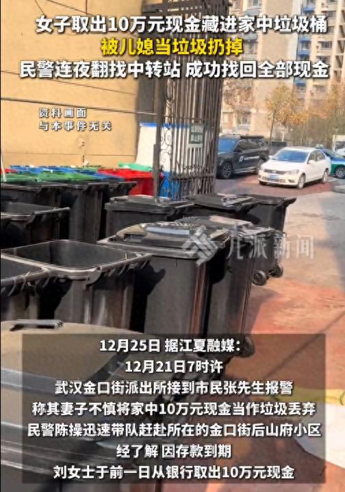 12月25日,@九派新闻 从湖北武汉江夏融媒获悉:12月21日7时许,金口街派出所接到市民张先生报警,称其妻子不慎将家中10万元现金当作垃圾丢弃。民警陈操迅速带队赶赴所在的金口街后山府小区。经了解,因存款到期,刘女士于前一日从银行取出10万元现金。为求妥善存放,她将现金装入帆布袋,外裹衬衣,悄悄塞进家中垃圾桶内,自认为此处不起眼反而安全。