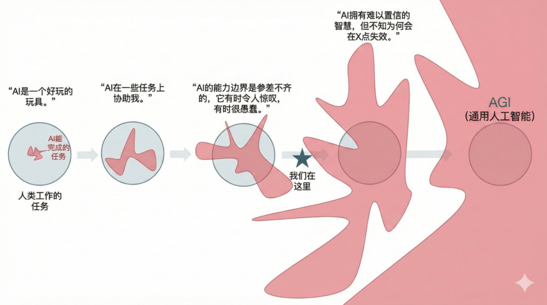 最后分享一个非常形象的图示——也是基于思维链和文生图的组合生成的AI作品——用来锚定在这个巨变的时代,我们当前处在的位置,以及即将撞上的未来。