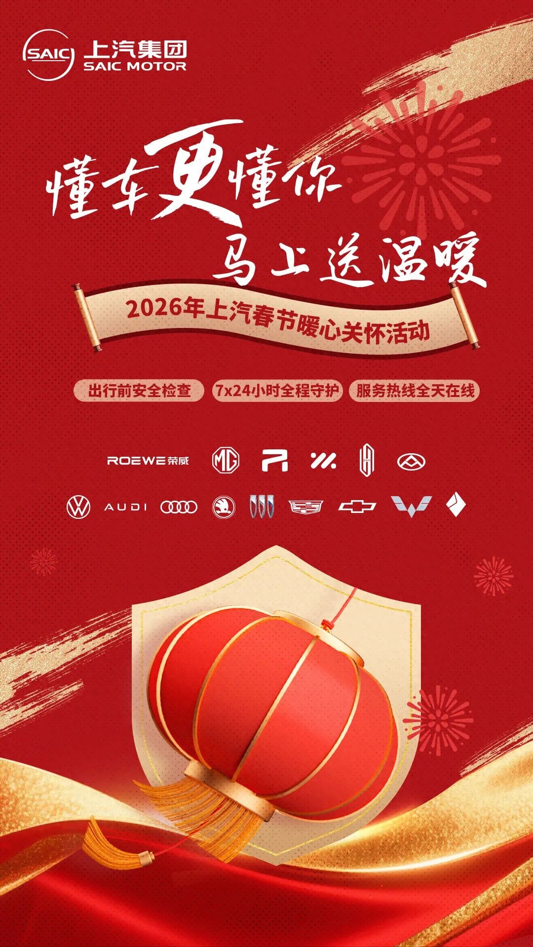 春节的脚步越来越近,自驾返乡、阖家出游的计划已经提上日程。为了让广大车主开开心心出门、平平安安回家,上汽集团将正式启动“懂车更懂你 马上送温暖——2026年上汽春节暖心关怀活动”,旗下荣威、MG、智己、尚界、大通、大众、奥迪、别克、凯迪拉克、五菱、宝骏等十余个整车品牌,以及遍布全国的5000+家服务网点正温暖以待,围绕“节前安心检测、春节全时守护、节后焕新出发”三大环节,为车主奉上一站式用车服务保障,全程“守护团圆路”。