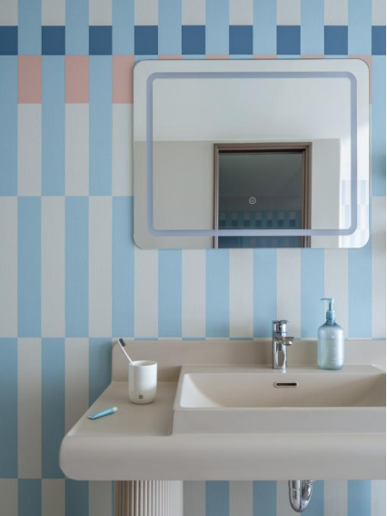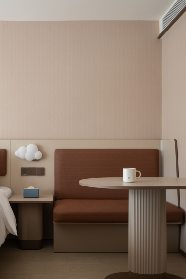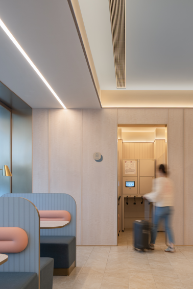 抵达时正是中午,小佳拖着行李箱走进大堂,没有刺眼的霓虹,没有刻意营造的艺术氛围,映入眼帘的是简洁明亮的空间,线条利落。配色是温和的米色与粉蓝色,透着一种家常的暖意。