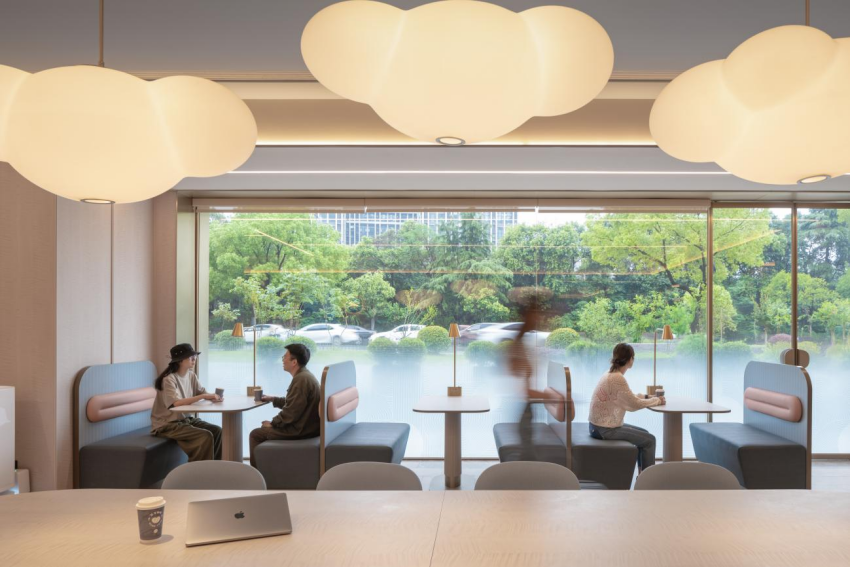 两个年轻人坐在一起低声讨论,手里还端着咖啡;一位挽着头发的姐姐,正端着一次性水杯喝水休息;还有人坐在舒适的沙发上闲聊。