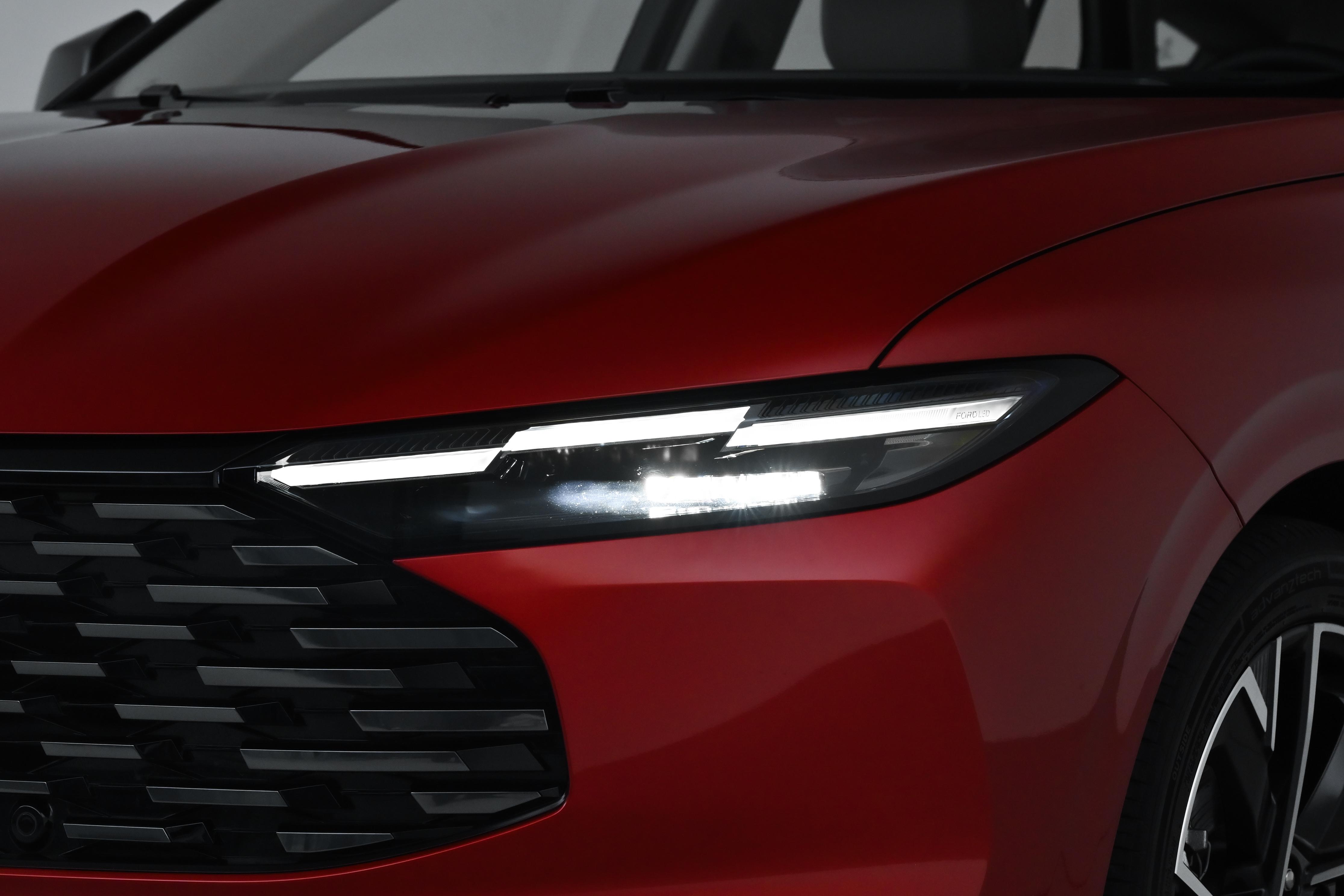 我选车,一眼还是看眼缘。新蒙迪欧豪华型还是招人喜欢的动感溜背范儿,这就是它颜值能打的底子。前脸线条从后视镜往大灯那儿延伸,把车头压得低低的,视觉上一下子就拉宽了不少。俯冲式的前脸看着大气又高级;引擎盖设计得干净利落,中间还带点凸起,妥妥的美系肌肉车运动味儿。我喜欢的前大灯又细又长,跟一双锐利的眼睛似的,和八边形前格栅上那圈升级的矩阵式镀铬饰条配在一起,严丝合缝,瞅着就特有劲儿。三段式日间行车灯一亮,辨识度直接拉满,感觉这车浑身上下都透着一股往前冲的劲头。晚上或者光线差的时候,这灯一亮,老远就能抓住别人的目光,在车堆里一眼就能认出来。