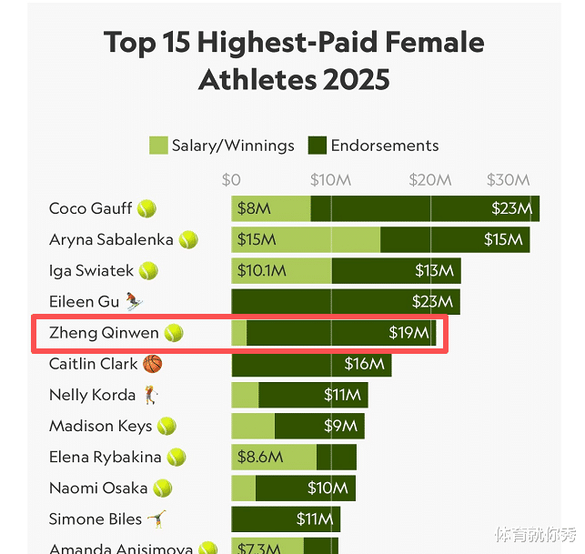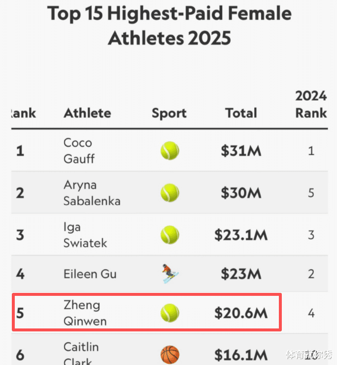 在收入最高的前10名女运动员中,有7人都是来自网球,其中高芙再次在这份榜单中排名榜首,尽管她今年的比赛收入为800万美元,并不是最高的,但是在场外的代言费,高芙的收入就高达2300万美元,是所有运动员中最多的。本赛季,高芙的总收入达到了3100万美元,继续排名榜首的位置,而排名第2的运动员有了变化,上赛季谷爱凌凭借着场外收入高居第二,但本赛季世界第一的萨巴伦卡表现出色,不仅拿到了1500万美元的奖金收入,代言费也有1500万美元。另一位网球运动员斯瓦泰克则是继续排名第3的位置,本赛季她的表现依旧是非常稳定,场下的代言也不少。而在这份榜单中,大家最关注的还是郑钦文,上赛季她表现出色,拿到了奥运会单打金牌,还在帕勒莫站和东京站的比赛中折桂。这样的出色发挥,也让郑钦文的名气暴涨,同时她的代言收入也是直线上升,上升到了第5的位置,而本赛季郑钦文因为伤病的原因,打的比赛并不是很多,成绩也算不上太好,但手握超过15个代言,让郑钦文的场下收入还是非常高的。