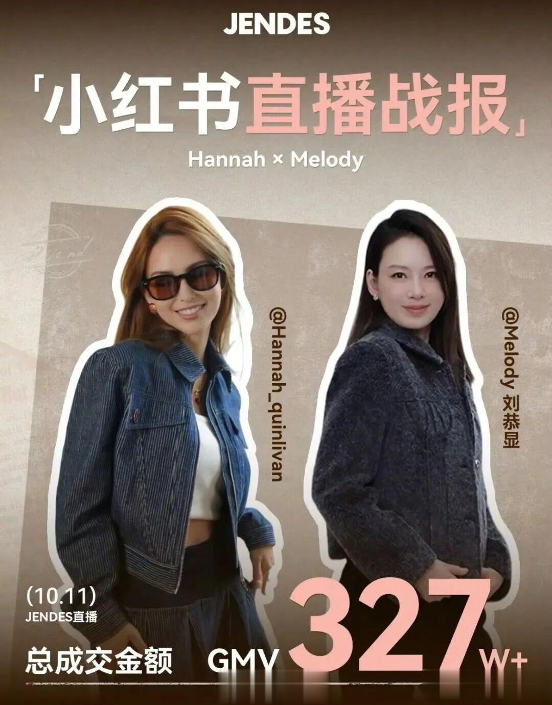 Melody刘恭显刷新了单场最高纪录,单场GMV达1700w+,平均客单价达2878元。值得一提的是,刘恭显直播间请来了天王嫂昆凌的助阵。昆凌也是带着自家品牌JENDES来的,最终品牌总成交额327w+。