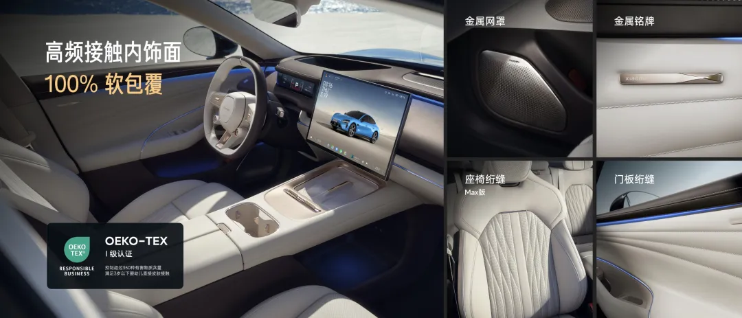 在内饰体验方面,新一代SU7的高频接触面接近100%软包,且通过了OEKO-TEX 100 最高等级认证,满足3岁以下婴幼儿皮肤直接接触,孕妇、小朋友都可以放心乘坐。