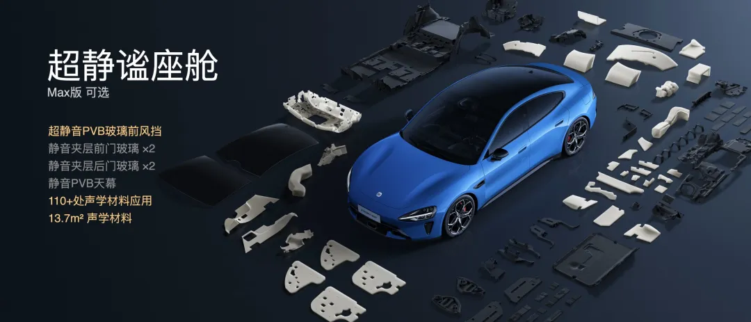 此外,座舱也进行了全面升级,全系标配四门静音夹层玻璃,提升座舱的整体隔音能力,其中Max版进一步升级为超静谧座舱,基于亚洲人听觉特性优化NVH表现,前风挡与天幕均采用PVB超静音夹层玻璃,增加高密度隔音材料,相比老款SU7 Max,平均隔声量提升3dB以上,静音性能达到D级豪华轿车水平。防晒隔热更加出色,新一代SU7全系标配前风挡三银镀膜玻璃与天幕双层镀银玻璃,侧窗采用隔热隔音夹层玻璃,防晒能力进一步提升。Max版新增首发双分区智能调光天幕,约2分钟前后排明暗分区,不仅调光速度更快,还能更好满足前后排光线不同需求,遮光、通透两不误。
