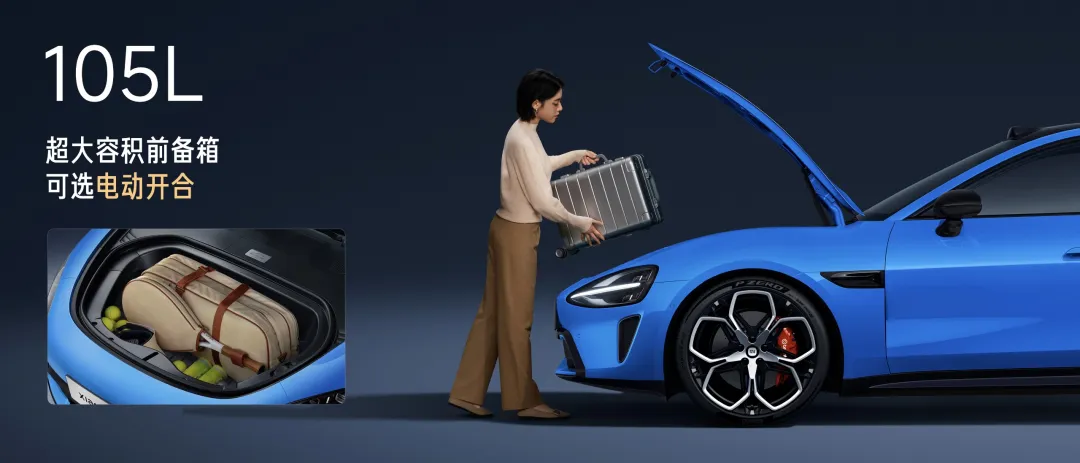 全系标配Ultra同款电动前备箱,支持8种开合方式,容积达105L,可容纳20英寸登机箱。开启方式包括车外实体按键、中控大屏、小米汽车APP、小米汽车APP小部件、遥控钥匙、UWB近场控车、车内小爱语音、车外小爱语音。
