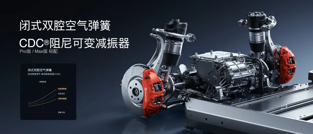 首先是硬件配置升级,小米蛟龙底盘全系装配前双叉臂、后五连杆独立悬架系统,Pro版和Max版配备闭式双腔空气弹簧和CDC®阻尼可变减振器,可智能识别路面状况,通过主动调节悬架,降低刚度以缓冲冲击,通过后再增大阻尼抑制车身晃动,大幅提升通过舒适性;同时车辆支持悬架自动升高功能,可记忆举升点位,在进入对应地理围栏时自动升高车身,驶出后自动恢复原车高度,兼顾通过性与日常驾乘质感。