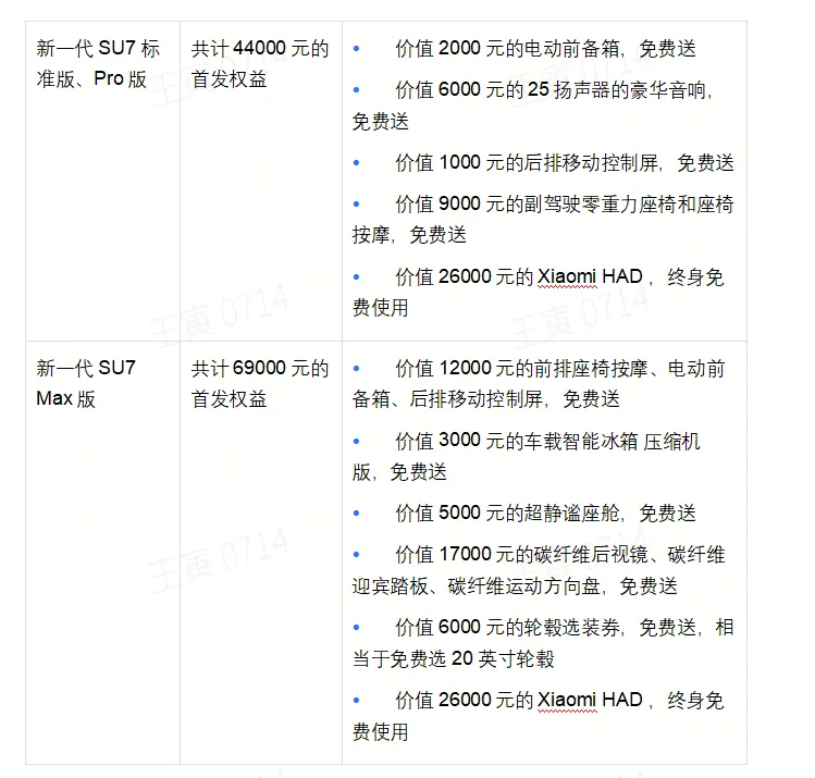 • 我们还为小米的老车主准备了增换购权益,小米汽车首任车主,增购或换购新一代SU7,赠送20000积分(价值2000元)