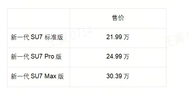 新一代SU7发布标准版、Pro版、Max版三个配置,售价21.99万~30.39万