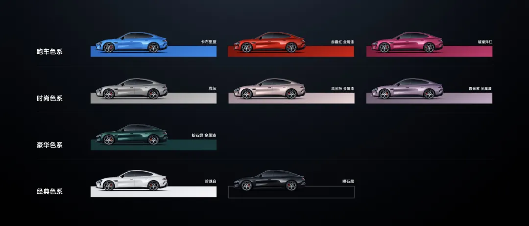 首先,在车色方面,新一代小米SU7依旧推出9款颜色,不仅保留了第一代SU7非常受欢迎的四款颜色:雅灰、珍珠白、璀璨洋红、霞光紫,同时延续了两款其他车系的好评色:来自Ultra的曜石黑、来自YU7的流金粉,除此之外,本次新SU7首发三款新颜色,分别是:卡布里蓝、赤霞红和靛石绿。