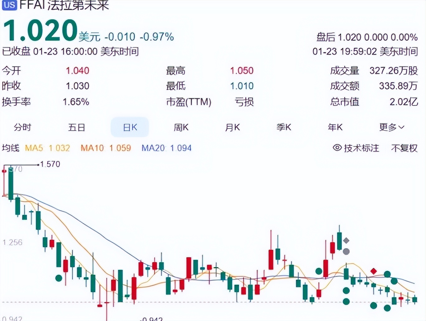 按照FF当前单季度亏损规模测算,其现金流仅能支撑几个月的正常运营,资本市场层面FFAI股价报1.02美元,总市值仅两点多亿美元。