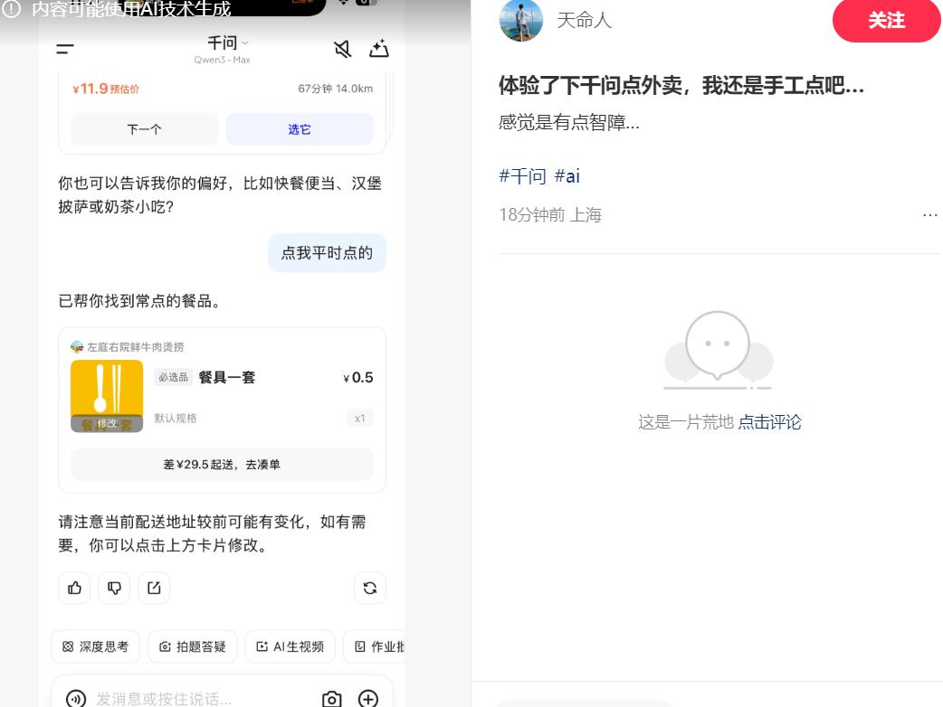 有网友表示体验了下千问点外卖,还是手工点吧…感觉是有点不聪明。