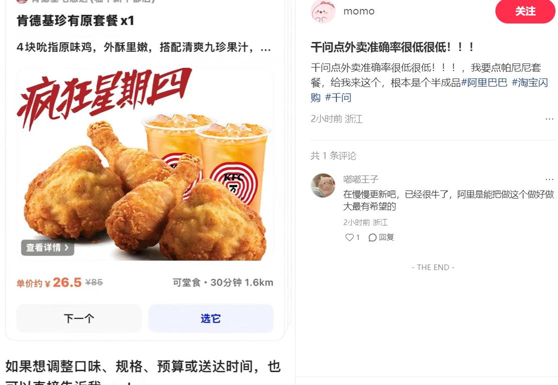 还有网友称,千问点外卖准确率很低很低,我要点帕尼尼套餐,给我来这个,根本是个半成品。