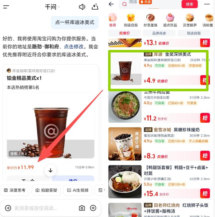 值接AI试着点了一杯库迪的咖啡,千问给出的价格是11.99元,但是淘宝闪购最便宜的价格只需要4.9元。