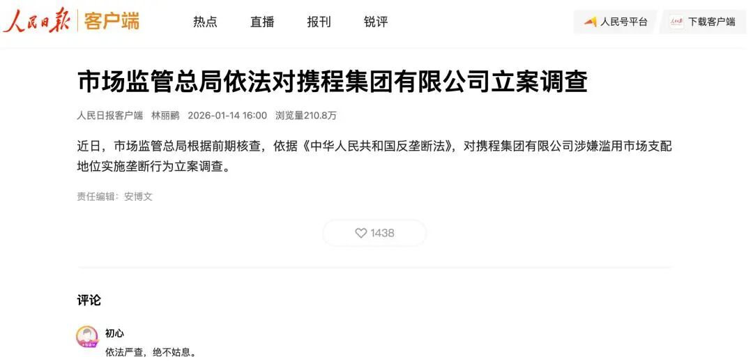 当一家企业的盈利规模远超行业上下游一众公司的利润总和,其背后潜藏的市场秩序问题,迟早会浮出水面。2026 年 1 月 14 日,市场监管总局发布公告,依据《中华人民共和国反垄断法》,对携程集团有限公司涉嫌滥用市场支配地位实施垄断行为正式立案调查。这则消息的发布,将此前围绕携程的用户抵制与商家投诉风波,推向了法制化监管的层面。