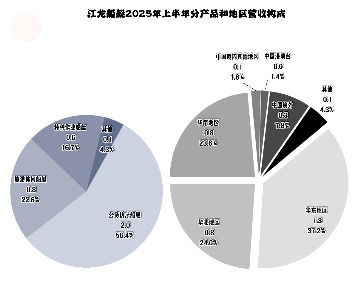 “公务执法船艇”是江龙船艇占比过半的核心业务,“旅游休闲船艇”和“特种作业船艇”也是重要业务; 主要市场在国内的华东、华北和华南,境外市场有7.8%的占比。