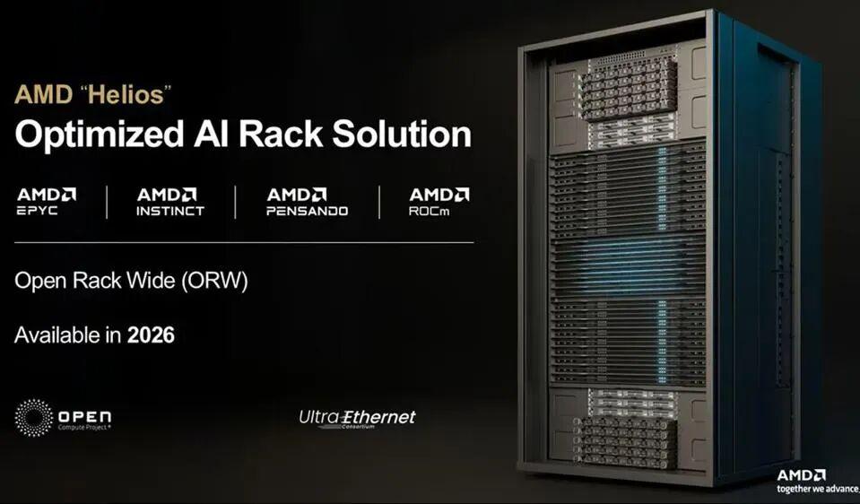 这批芯片被装在一种叫做 Helios 的机架里。这个机架是 AMD 和 Meta 一起设计的,使用了液冷散热,每个机架最多塞 72 块 MI450。Meta 计划从 2026 年下半年开始陆续部署,先上 1 吉瓦,后面慢慢加到 6 吉瓦。