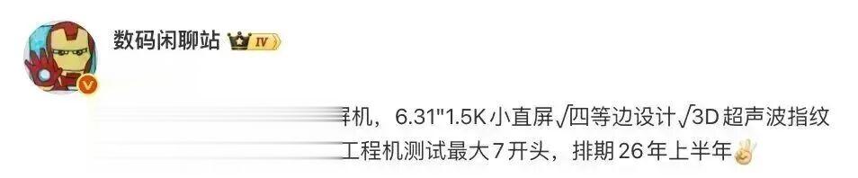 在此之前,这位博主的消息中也提到过这款新机,定位骁龙8E5性能小屏机,6.31"1.5K小直屏,四等边设计,3D超声波指纹,IP68,工程机测试最大7开头电池,排期26年上半年。