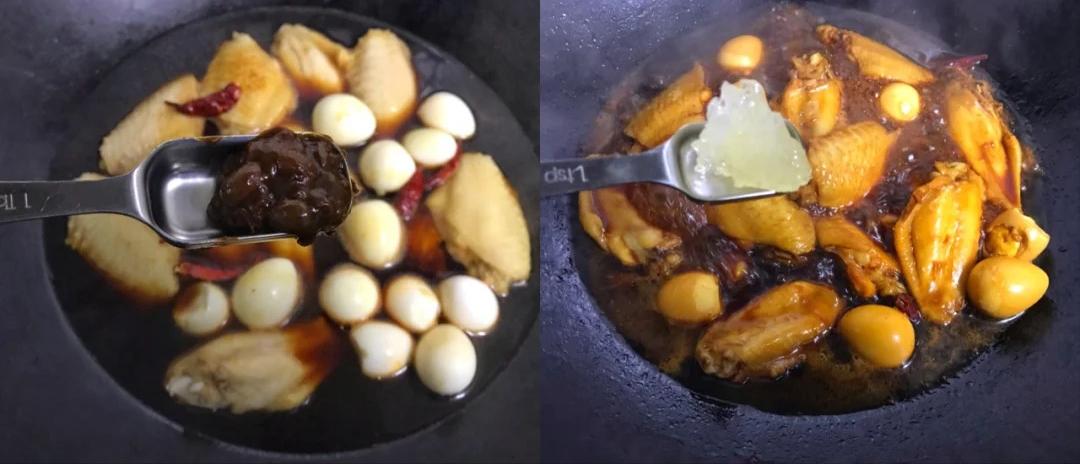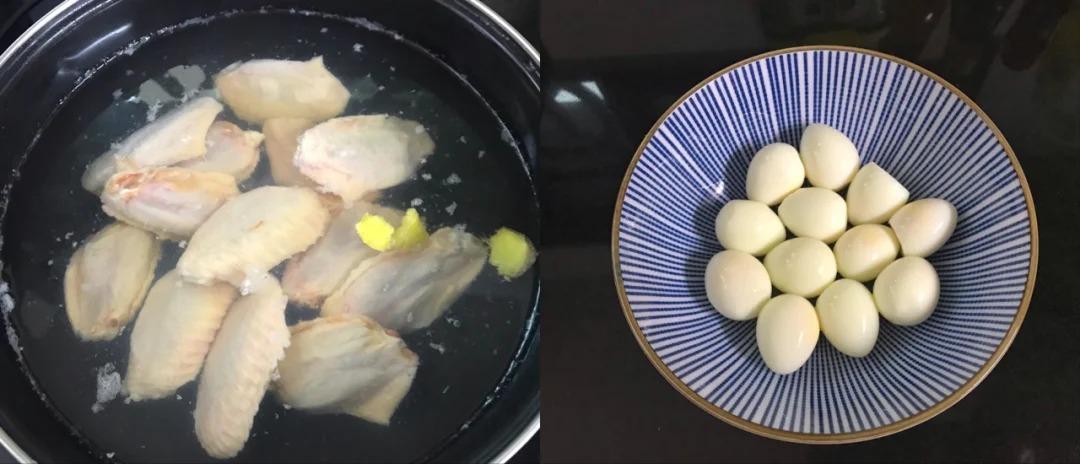 食材:12 个鸡翅中、150 克鹌鹑蛋、料酒 2 勺、生抽 2 勺、老抽 1 勺,黄豆酱 1 勺、冰糖,