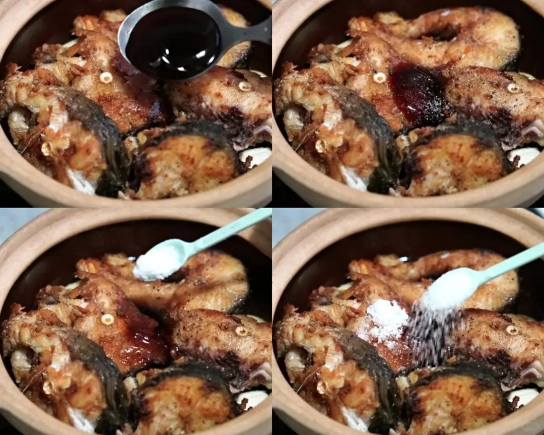 3、拿出个砂锅来,把切好的土豆片铺在砂锅底部,就像给鱼块铺了个小床。再把蒜片、姜片还有干辣椒放进去,接着把煎好的草鱼块平平整整地码在上面,倒 2 勺生抽、 1 勺蚝油、半勺黑胡椒粉、盐和糖都放上小半勺,最后半瓶啤酒倒进去,再加上半碗清水,。盖上砂锅盖子,开小火慢慢煮个 15 分钟;