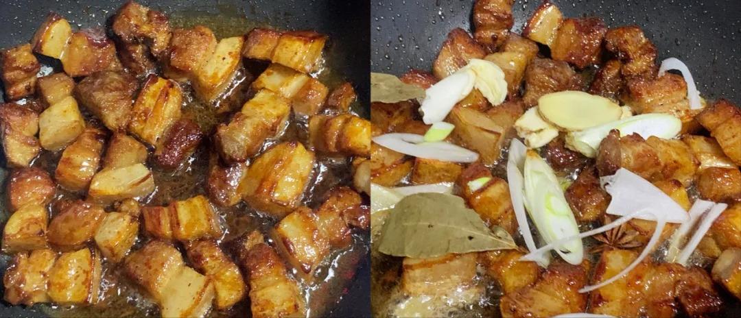 3、这时候锅里还有不少五花肉煎出来的油,咱就利用这些油来炒糖色。炒好后把五花肉倒进去翻炒裹上一层漂亮的糖色,把葱姜蒜、八角、香叶、桂皮都放进去,一起炒一炒
