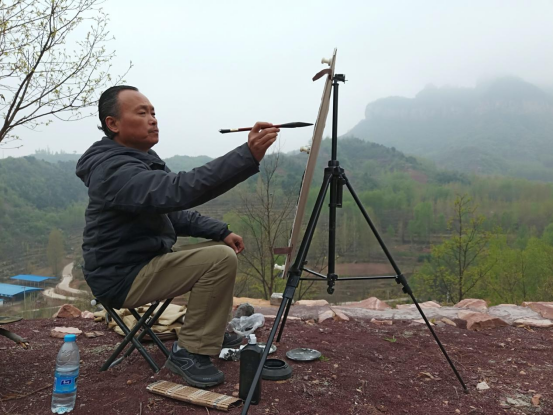 初到嵩山,刘柏山便被这里的雄奇山水、深厚文脉深深吸引,嵩岳的巍峨,太行的苍茫,少林寺的禅意,河洛大地的人文风情,都成为他笔下取之不尽、用之不竭的创作源泉。他踏遍嵩山的山山水水,深入太行的沟沟壑壑,走到哪里,画到哪里,登山临远,观云赏雾,写生创作,收集第一手的创作素材。而在多年的艺术实践中,他更将写生放在首位,十几年以来,深入太行山、黄山、中岳嵩山、岭南丘陵、巴山蜀水等多地写生,在山林中熟悉大自然的味道,感受恢宏的山骨形态、苍林厚土、民居窑洞,让心与画相融,性与灵相通。