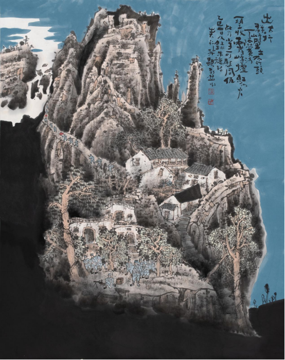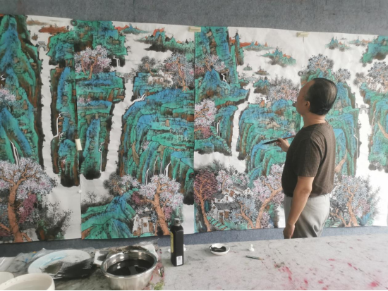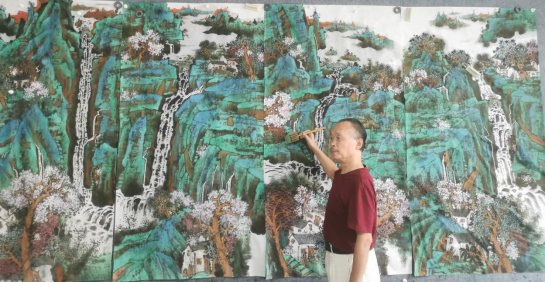 他的笔下,依旧有雍容华贵的牡丹,有铁骨铮铮的梅花,但更多的,是嵩岳太行的青绿胜景,是河洛大地的山水风情,是新时代的山河盛貌。每一幅作品,都凝聚着他对自然的热爱、对文脉的坚守、对时代的感悟,他在传统青绿的设色中融入现代审美,在笔墨的运用中兼顾南北韵味,让青绿山水既有古意,又有新意;他始终秉持 “外师造化,中得心源” 的理念,师古人更师自然,让笔墨意趣表现自然的本质,让丹青色彩描绘时代的风华。