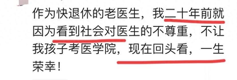 作为快退休的老医生坦言,二十年前就因为看到社会对医生的不尊重,不让孩子考医科大学,现在回头看,一生荣幸!