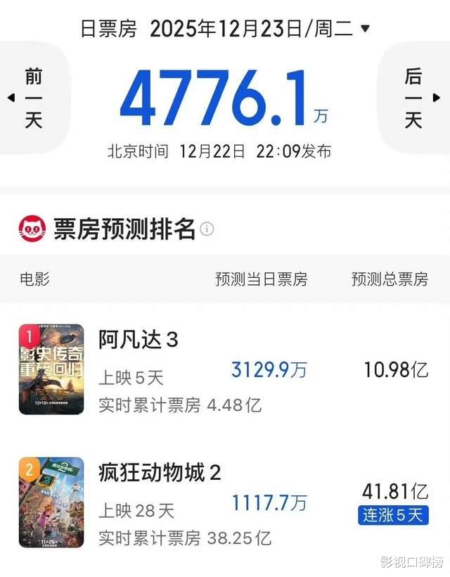 《阿凡达3》在考研结束后的工作日第一天,预测票房4300多万,实际票房3670多万,比预测的差了600多万,最终预测票房被下调至10.98亿。另外,有消息说,如果《阿凡达3》票房不及预期,卡梅隆可能会放弃拍摄第四、五部。