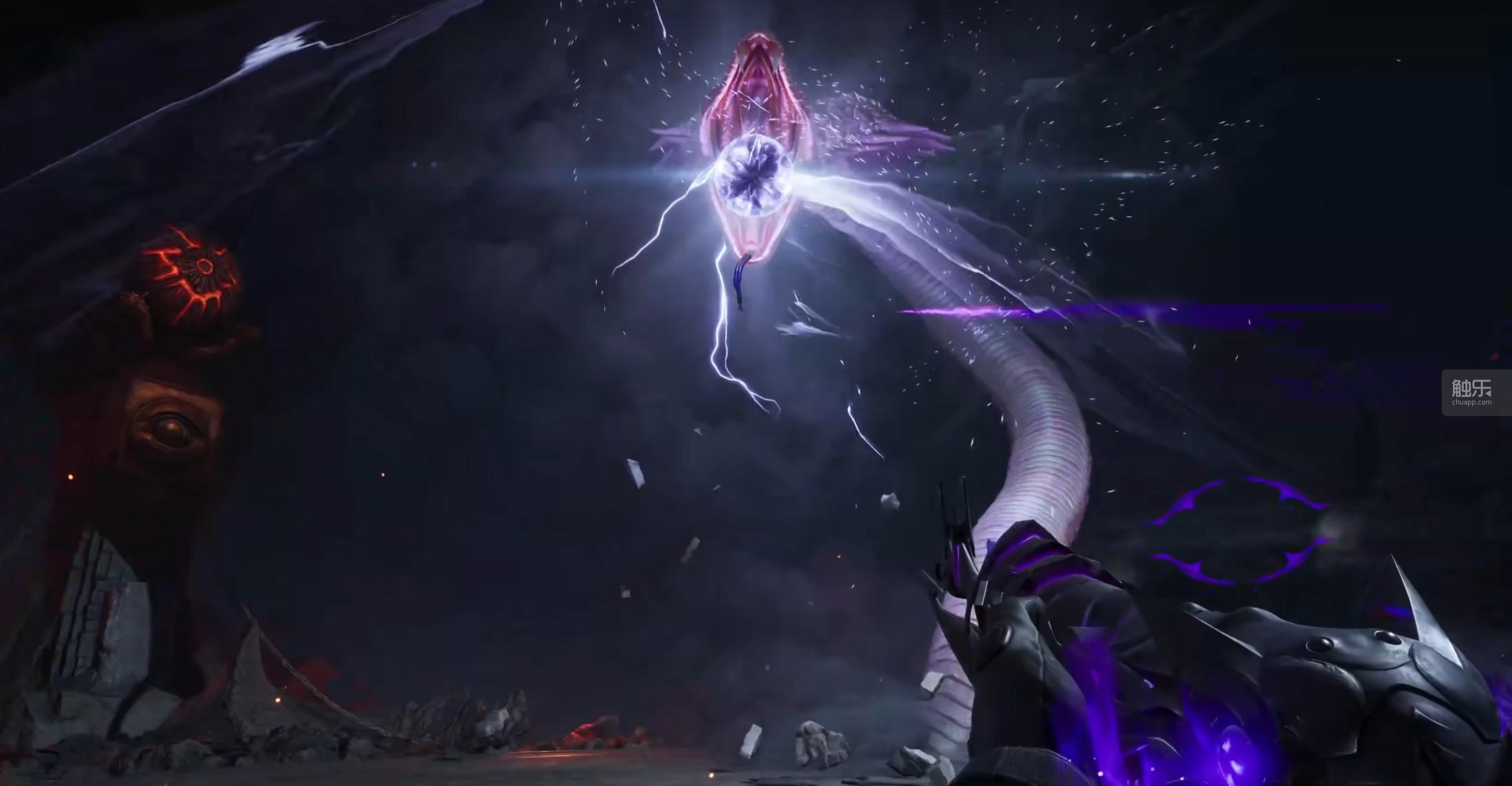 “昆仑神宫”的最终Boss是一只巨眼蛇身的怪物,诡异,又极具神秘感——第一阶段时,血条上的ID只是一串问号。蛇身在空中穿梭游龙,巨大又灵活,我想瞄准跟枪都变得十分困难。决战场地的水潭里会实时反射它的动作,远处的天光阴暗泛红,碎石在虚空中漂浮。