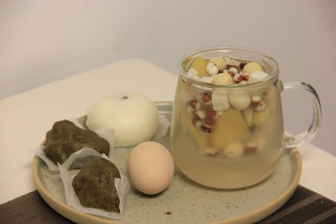 所有食材放进电饭锅,加清水,上面蒸了今天的早餐, 一个包子,两个青团(青团我随意捏的,都没有揉圆),再加一个鸡蛋。