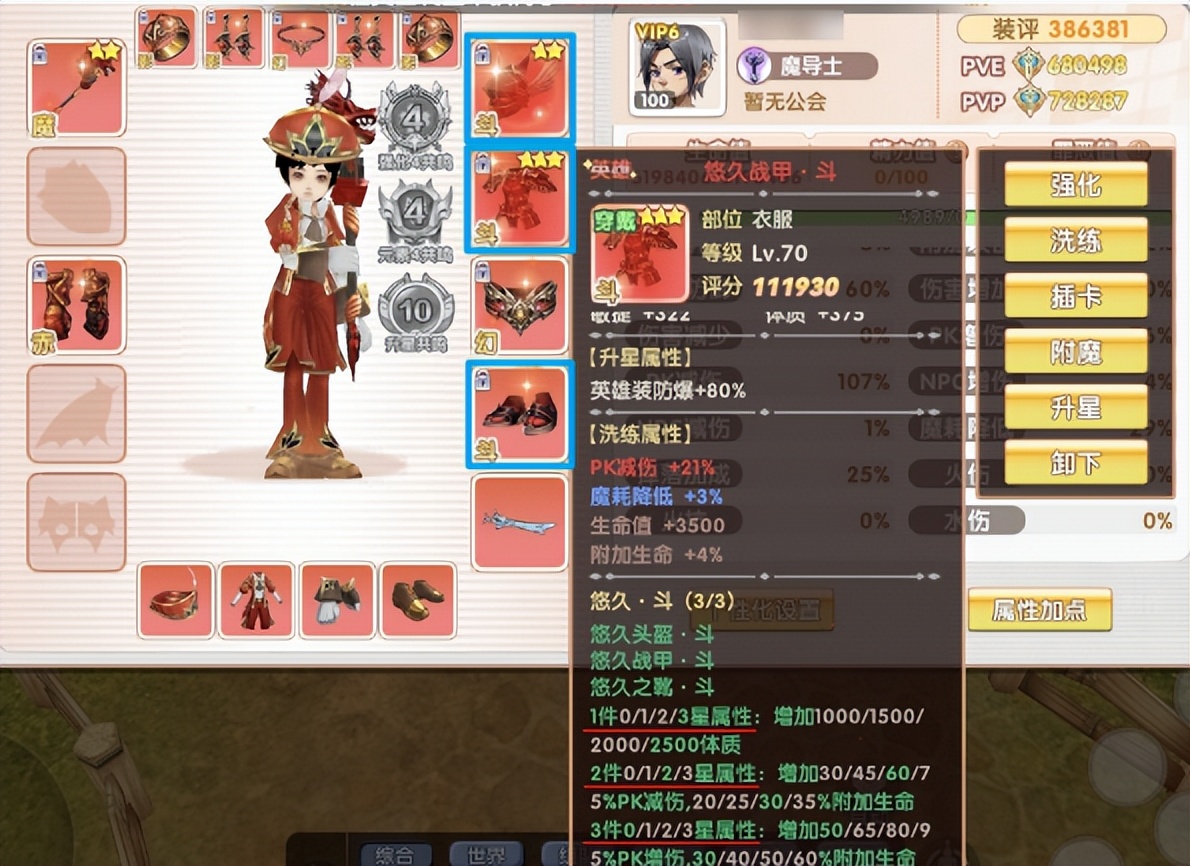 英雄装搭配优先冲套装属性,2/3件套额外加成远超散搭,且效果叠加,3件套可激活1+2+3件全属性。