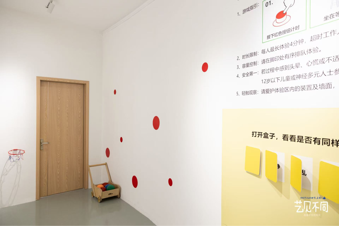 在这个精心设计的体验中,策展人耳东以富有创意的方式呈现了ADHD大脑认知的几个特点:红色按钮装置呼应了ADHD的专注力容易被新鲜、凸显的刺激的快速响应的特征——使得他们会呈现出来注意力容易分散、思维比较跳跃、容易跳出框架的特点。静坐等待铃声想起的任务,则模拟了人们在不知道接下来会发生什么,什么时候会发生的情况下,也会开始烦躁和不安;当铃声响起,参与者需要根据指令迅速切换任务,去拍打墙上的红色圆点,有的人切换快,有的人则会愣住一会儿,展现了大脑的认知灵活性是存在个体差异的;最后的投篮环节,要求参与者完整记忆流程并协调动作,让人体会到复杂的材料需要在短时间内记忆的挑战。