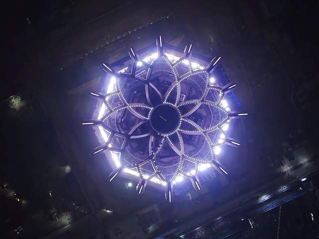 最引人注目的是顶部的塔冠。其造型如一朵舒展的牡丹,由64个精工构件组合而成,其中单件最重达11.5吨。借助数字化设计与精密装配,这些构件最终严丝合缝地构成双曲面轮廓,成为整座建筑的视觉焦点。