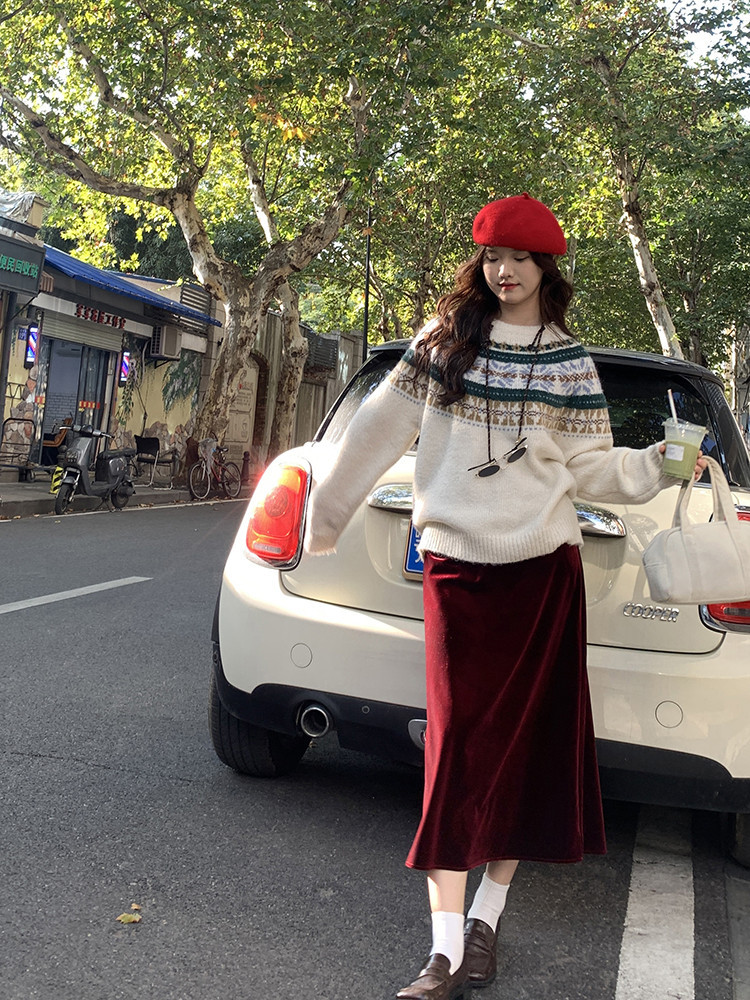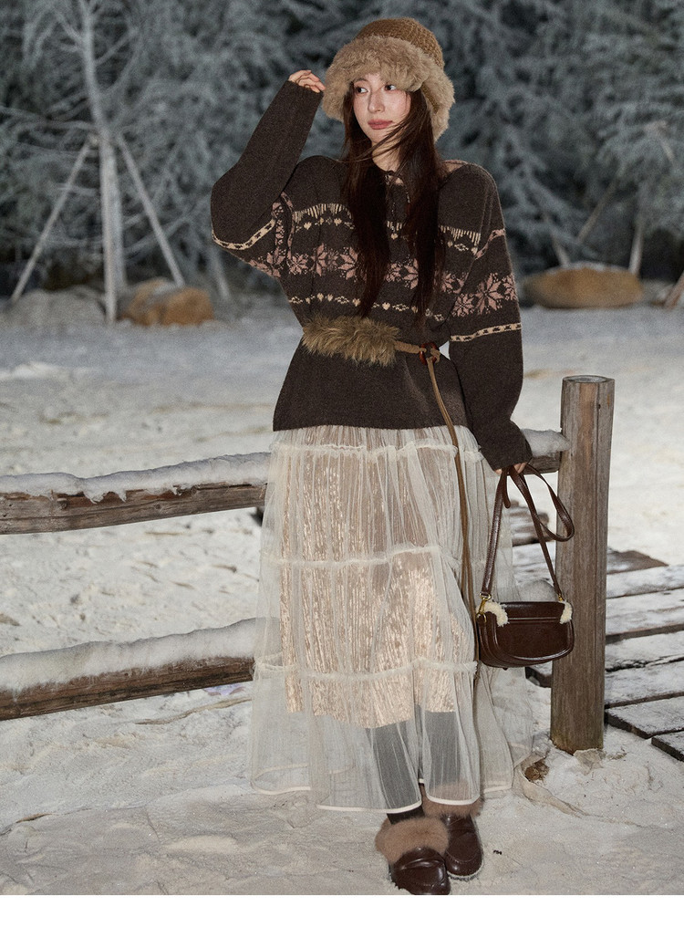 费尔岛毛衣的复古肌理,与裙子堪称冬日柔美感 CP!