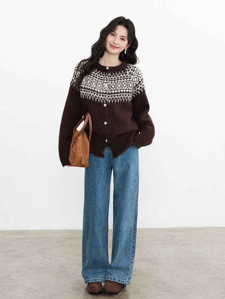 咖啡色费尔岛毛衣搭配蓝色牛仔直筒裤,焦糖色包包与咖啡色短靴上下呼应,和牛仔蓝形成反差。