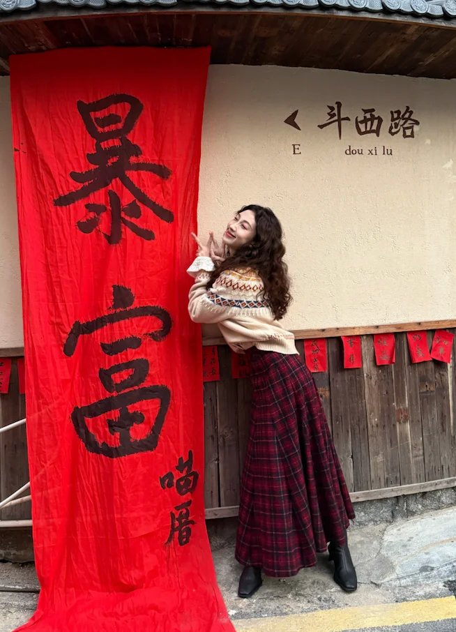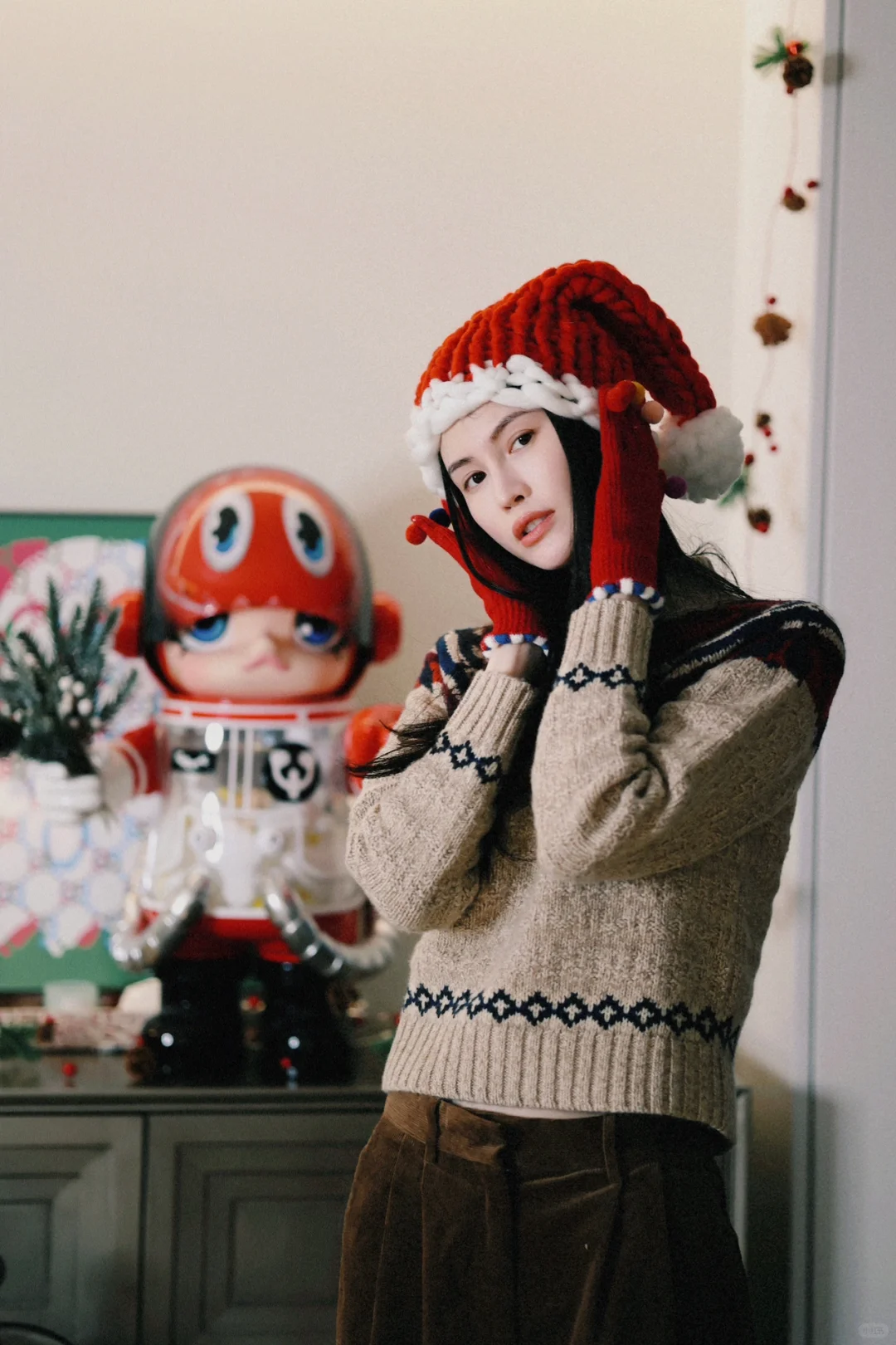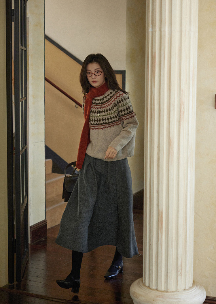 米杏色费尔岛毛衣搭配灰色A字半裙,裙摆划出优雅弧度,完美修饰身形,配一条红色围巾,既是颈间的温暖守护,更是整体造型的灵魂所在。